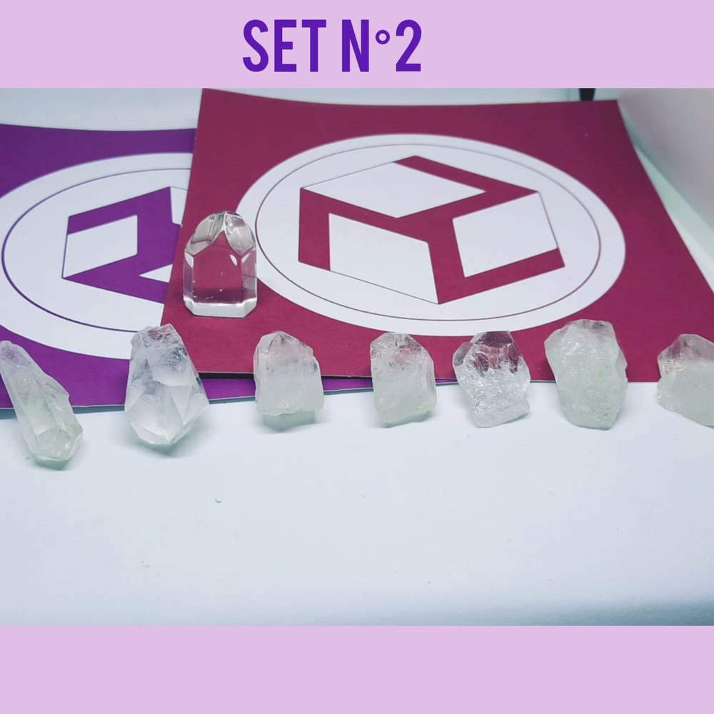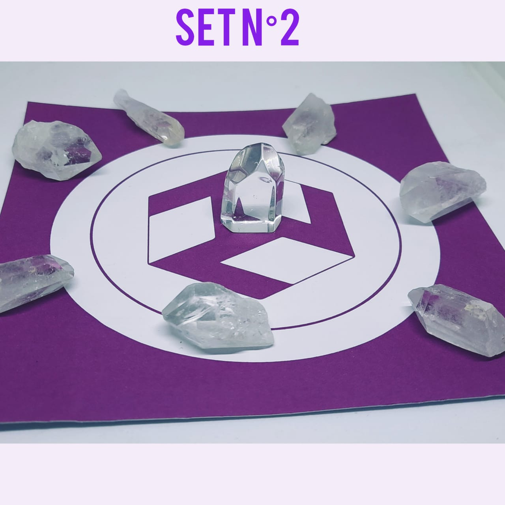 7 puntas de cuarzos, 1obelisco chico maestro natural pulido y los dos sĂmbolos Antahkaranas impresos.