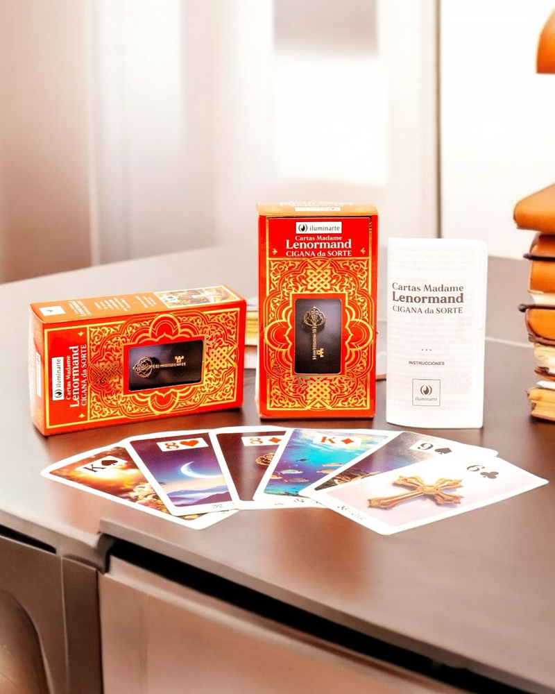 Un mazo de cartas de tarot inspiradas en el famoso oráculo de Madame Lenormand, con ilustraciones detalladas y simbologĂa rica en significado para consultas de adivinaciĂłn y autoconocimiento.