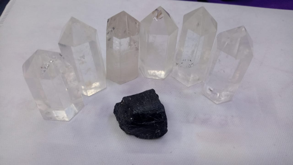 Set de 6 cristales mediano facetados con base y punta, de hasta 300gms el peso el set. Incluye turmalina mediana de regalo.