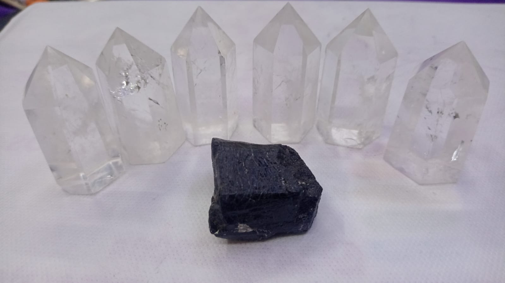 Set de cristales grandes facetados con punta y base e hasta 400 gms de peso el set. Incluye turmalina mediana regalo.